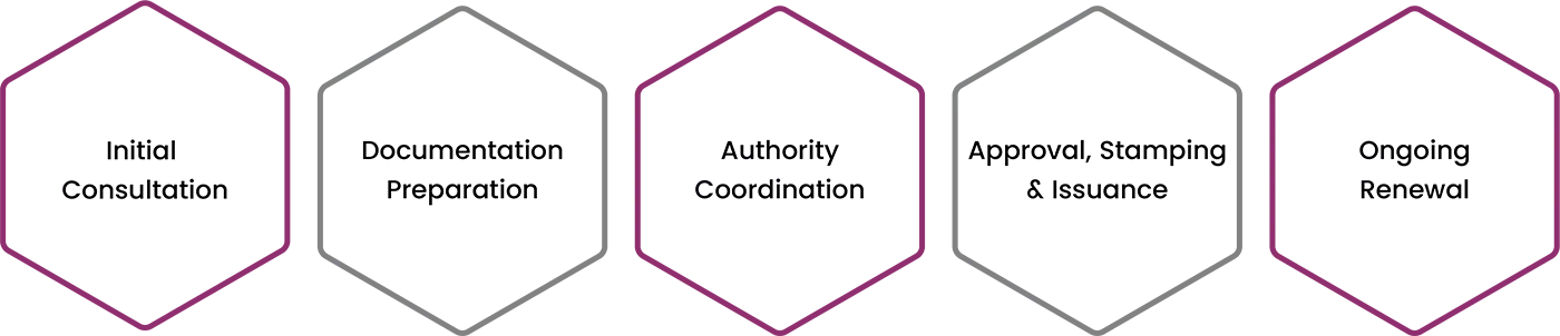 | Application Preparation | 3–5 working days | 400 – 800 | Includes forms, document verification, and coordination |